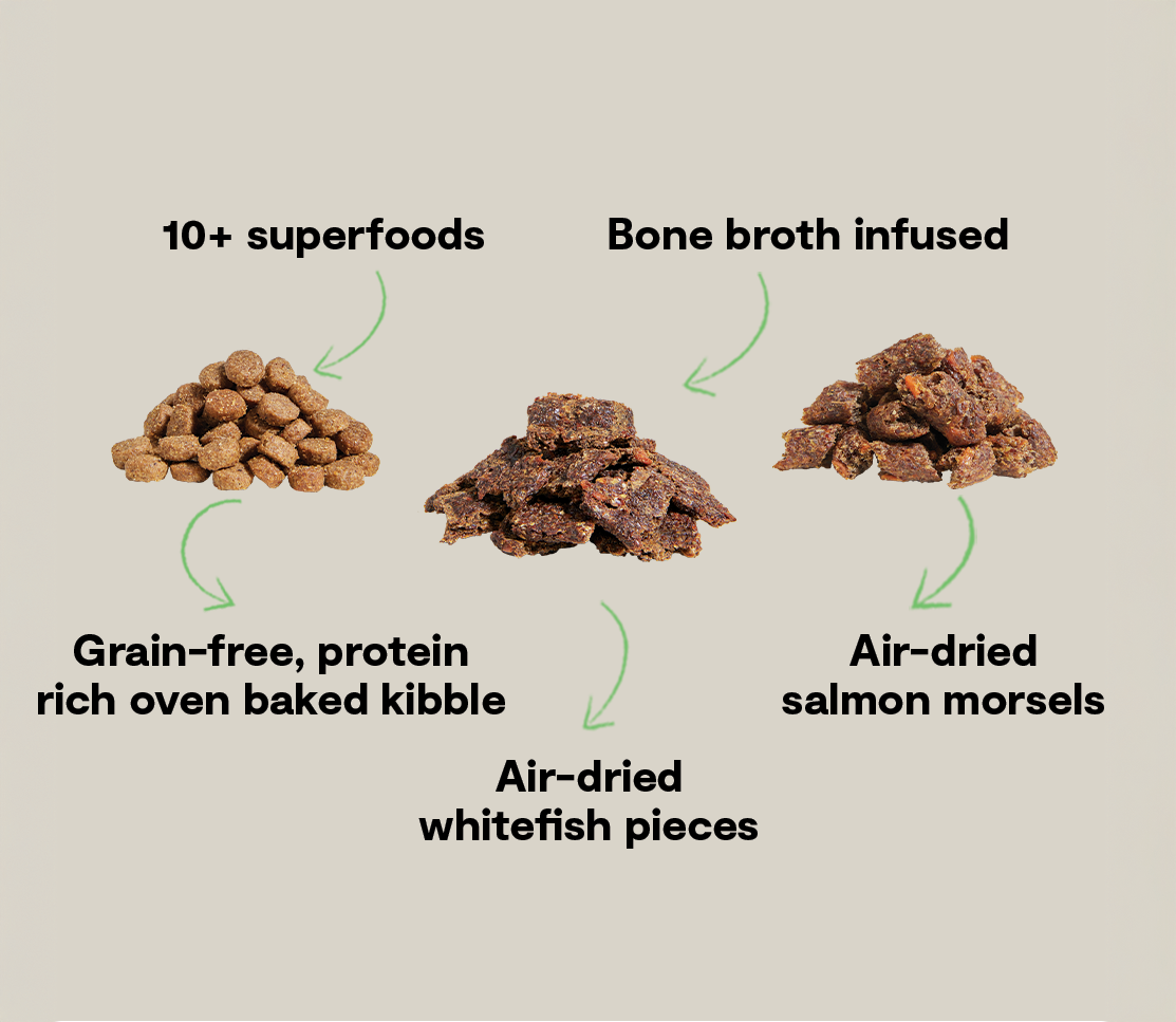 Level up your dog’s mealtime with our ultimate high protein, grain-free superfood bowl which combines an epic blend of oven-baked salmon kibble coated in probiotics with gently air-dried, nutrient dense salmon morsels and whitefish pieces. This powerhouse formula delivers irresistible taste with a nutritional boost, packed with 10+ superfoods rich in antioxidants.