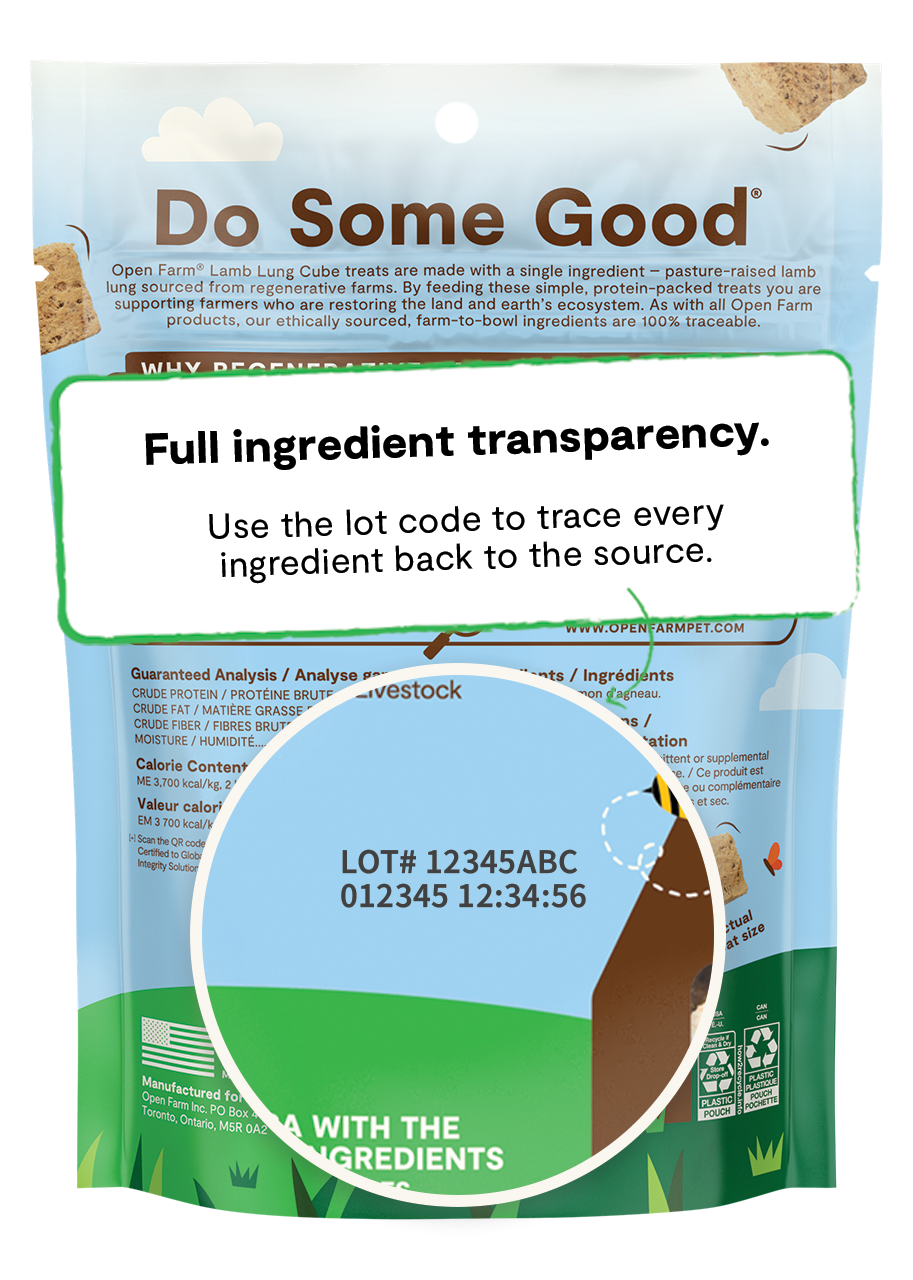 This treat is part of that commitment. Sourced from regenerative farms, Open Farm’s Regenerative Lamb Lung Cubes reflect our dedication to high-quality nutrition, animal welfare, sustainability, and transparency. More than just a snack, they are part of a virtuous cycle that touches every aspect of the food system.