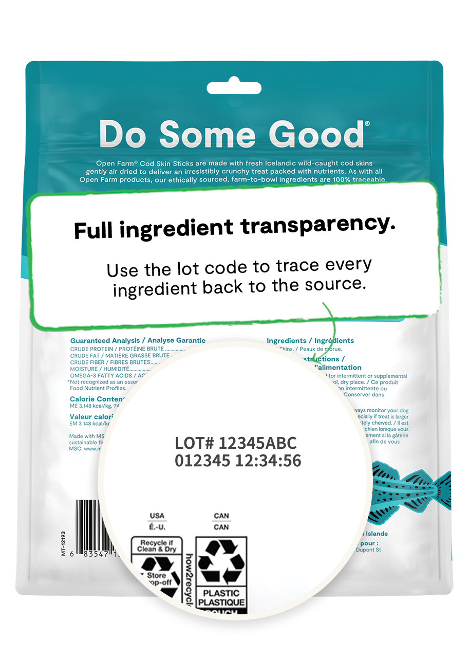 Just as with our recipes, we are also committed to transparency by sharing everything pet parents need to know about what’s in their pup's treat jar. That’s why, for every Open Farm treat, you will find the geographic origin of each ingredient, safety test results for each treat, third-party certification details, and information on carbon emissions.