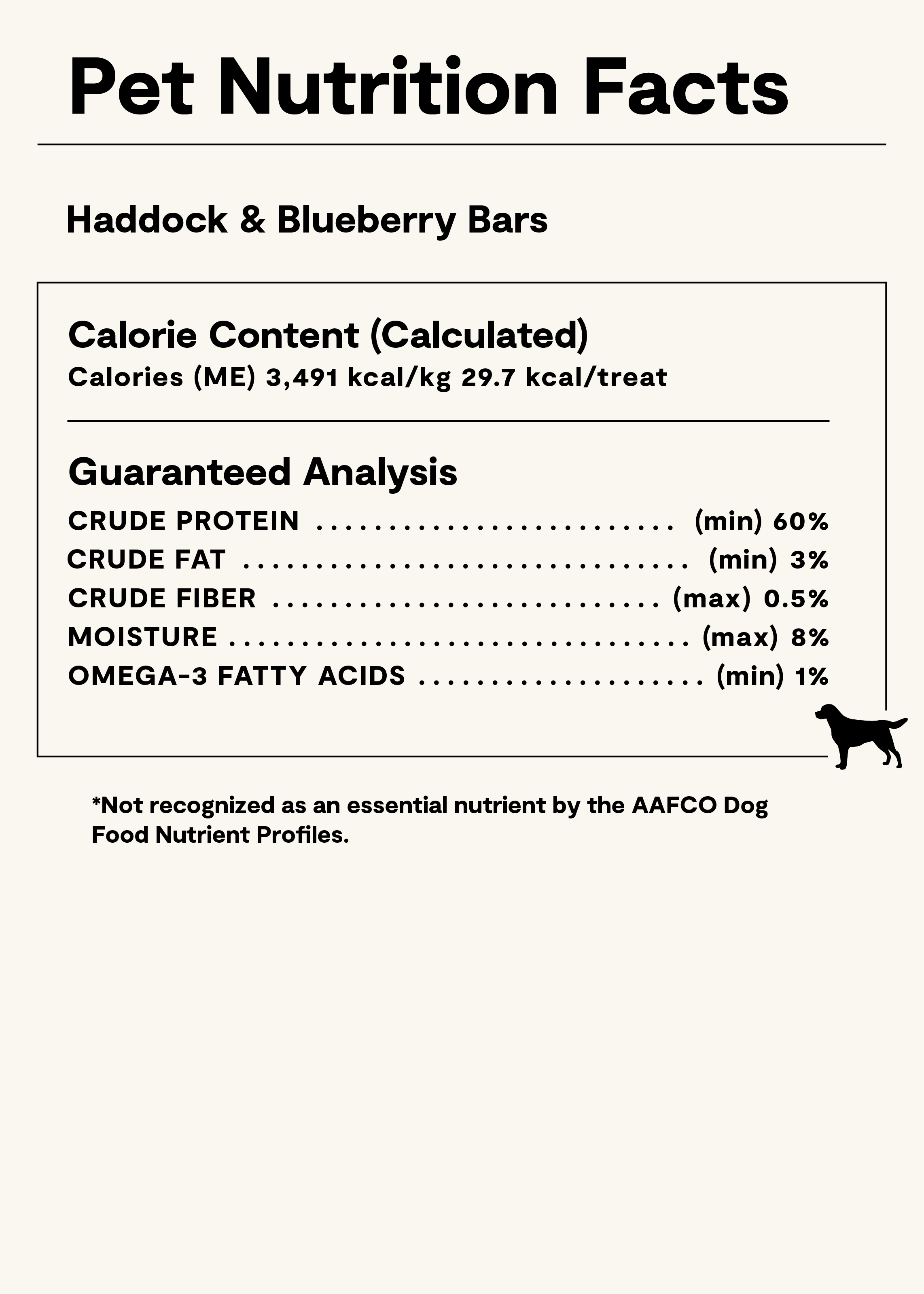 Our Haddock and Blueberry bars are made with only 2 ingredients and feature fresh Icelandic MSC certified wild-caught haddock gently air dried to deliver an irresistibly crunchy treat packed with nutrients. These delicious treats are crafted in a human-grade facility with 100% human-grade ingredients with Omega-3 fatty acids for healthy skin and coat.