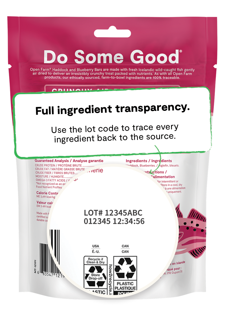 Just as with our recipes, we are also committed to transparency by sharing everything pet parents need to know about what’s in their pup's treat jar. That’s why, for every Open Farm treat, you will find the geographic origin of each ingredient, safety test results for each treat, third-party certification details, and information on carbon emissions.