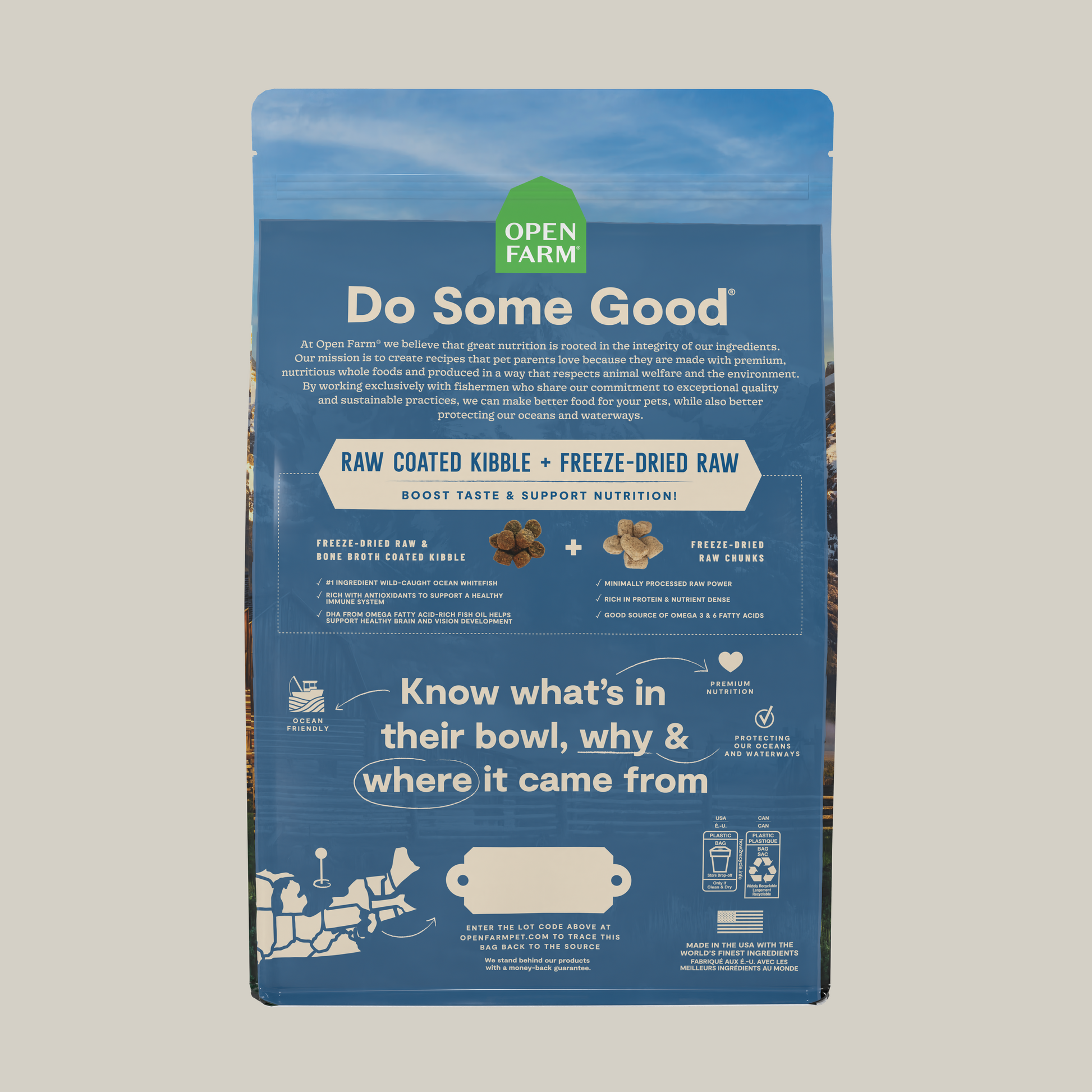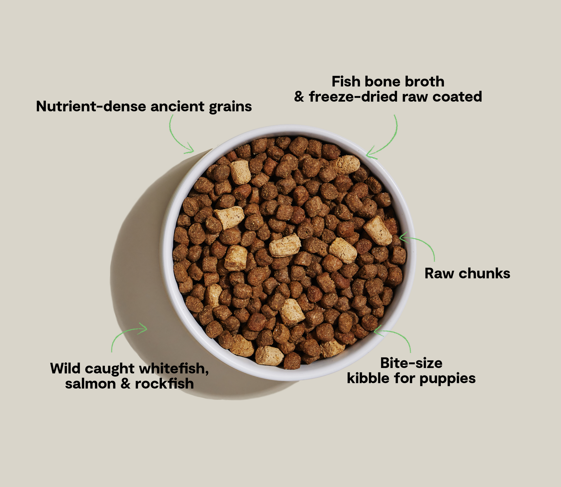 ReWild their diet with this blend of wild-caught salmon, whitefish & rockfish. Formulated specifically for the nutritional needs of puppies. Featuring a smaller kibble size, covered in a fish bone broth and freeze-dried raw coating, including DHA from omega-rich fish oil to help nourish brain and vision development. Bonus freeze dried raw chunks provide a protein-packed boost, while nutrient-dense ancient grains and superfoods like pumpkin ensure a complete and balanced nutrition.