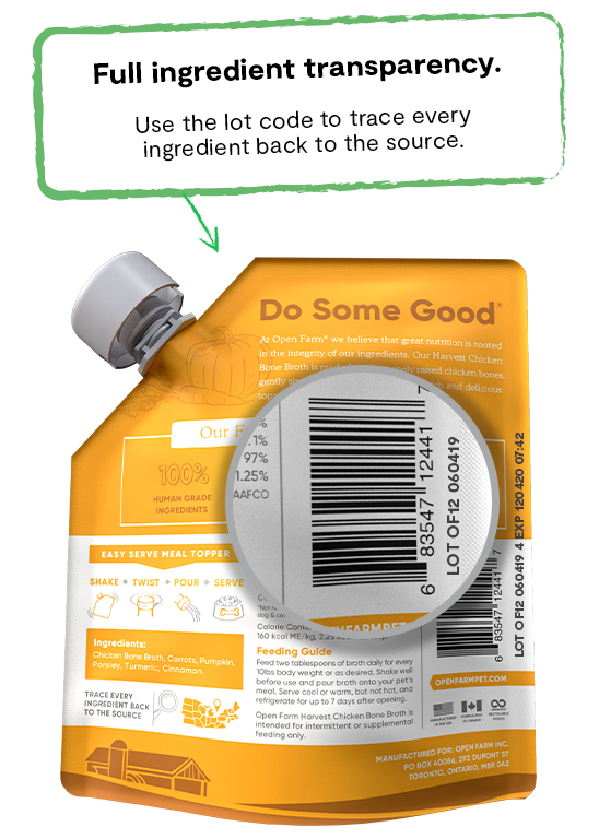 We're also committed to transparency and sharing everything pet parents need to know about what’s in their pet’s bowl. That’s why for every Open Farm recipe you will find the geographic origin of every ingredient, safety test results for each product, third-party certification details, and carbon emissions.