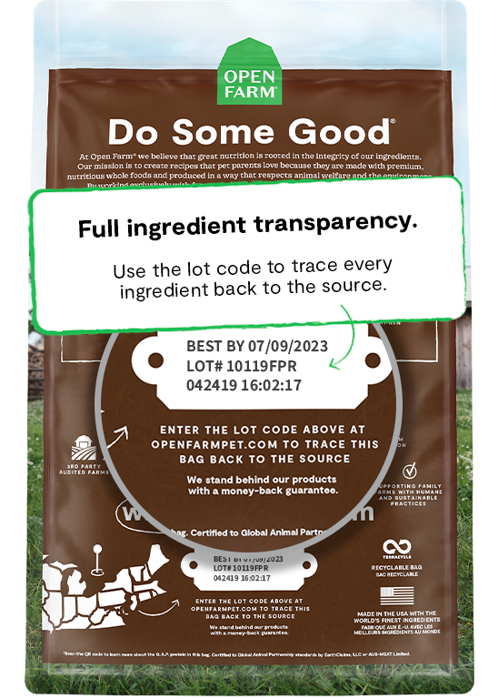 Our 30-day satisfaction guarantee covers the full recommended transition period from your pet’s old food to their Open Farm new recipe, plus plenty of extra time to reach out to us to initiate a return if needed. If you or your pet aren’t completely satisfied for any reason, we’ll gladly provide a full refund or exchange for recipes purchased on OpenFarm.com within 30 days of delivery.